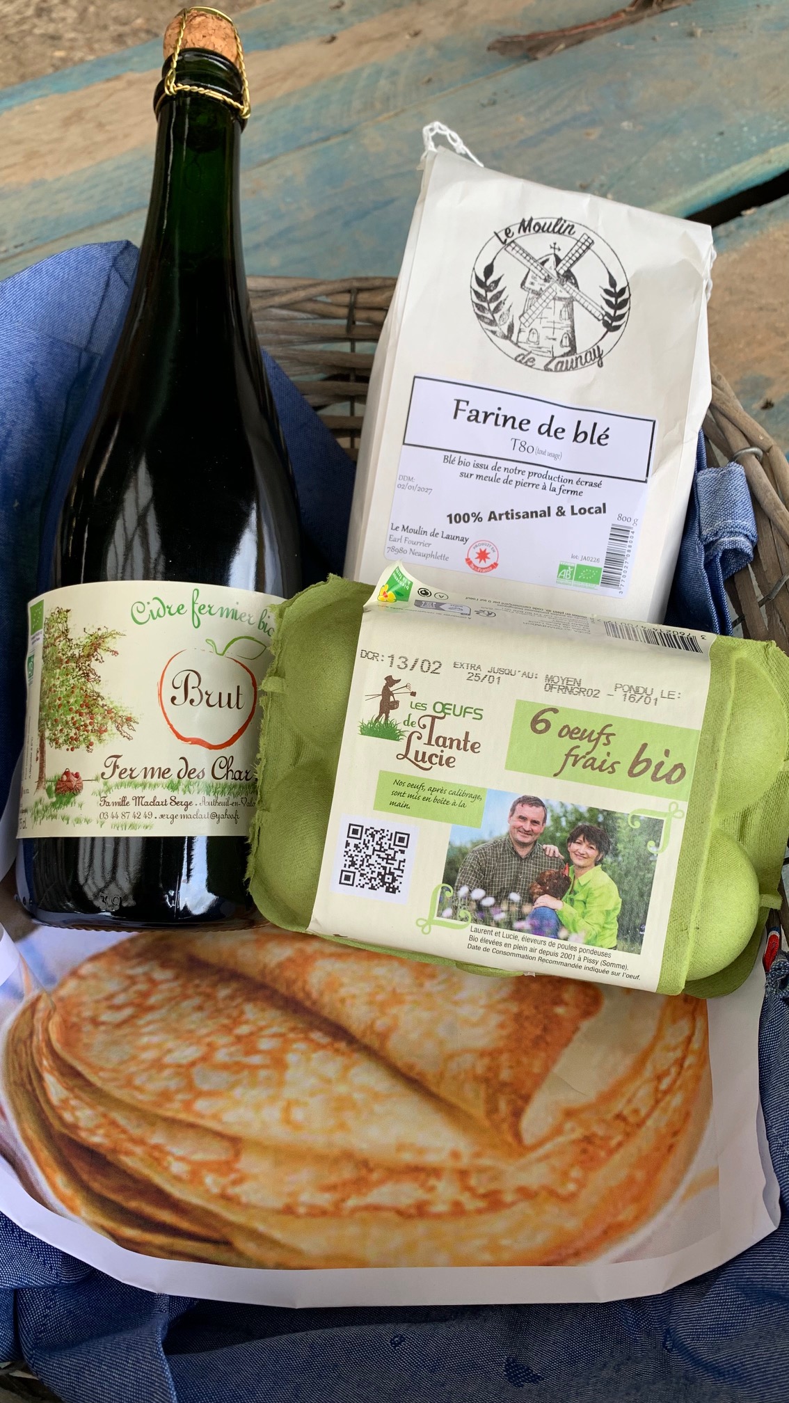 Pour les familles de 2 à 4 personnes : 1 boite d’œufs moyens bio, 1 paquet de farine de blé 800g bio, 1 Cidre fermier brut 75 cl bio